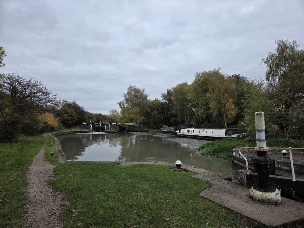 I rang CRT and explained and they said they would get somebody out. After about 45 mins of “stuckness”, the water levels started to recover (because we had shut the gates behind us) and we gently floated off and managed to make it into Lock 19 and out the other side. The next locks were the 4 Bascote Locks (2 singles and staircase pair). And it was there we encountered the boater who we suspected had been responsible for the unclosed lock gates. (he’d been the last boat through yesterday teatime).