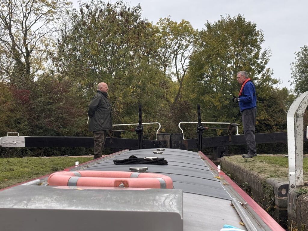 We woke up early on Thursday – Paul’s day off – so we thought we might as well make a start. We set off with fresh coffee and a Pain au chocolat in hand as a quick breakfast. At the first couple of locks – Itchington and Shop lock – we met a Mum and her son having a boating holiday together. The Mum was steering, whilst the son – who volunteers at Lapworth and Hatton locks – made himself very useful and we fairly flew through them and made a good start on the 8 locks in the Stockton flight. Those went well too, until we caught up with our old chap from the day before.