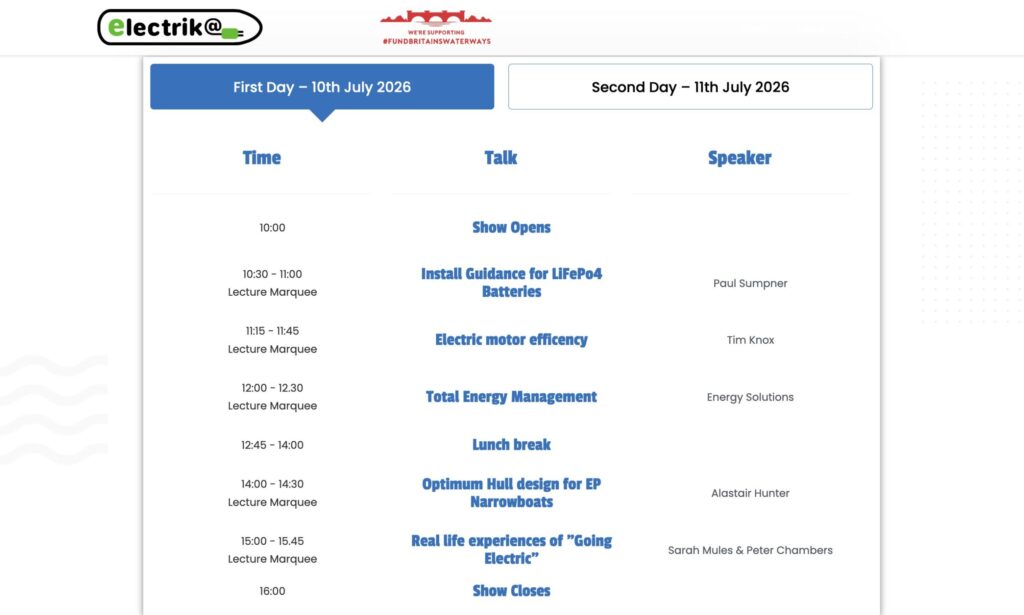 Electrika is intended to be a fun, friendly and FREE show for existing and potential electric narrowboat owners to meet up and share experiences and information. In addition new show boats are on the water for people to view, equipment manufacturers and suppliers are on hand in the exhibition tent to answer your questions and a full program of expert seminars takes place over the two days, covering important topics as shown below…