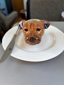It was a beautiful sunny morning and we tucked into boiled eggs for breakfast – possibly for the first time this year, as we have done a lot of travelling on Sundays. Paul got to use his Border Terrier egg-cup, a birthday gift from my dear friend and ex-colleague, Eliie.
